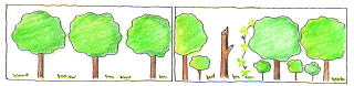 答えは右.様々な草や木が生えている複雑な構造の森には,それぞれの植物を食べる昆虫がすみ,その昆虫を食べに鳥がやってきます.鳥も,枝葉の茂みや枯れかけた枝,低木が混んでいるところ,薮など,餌をとる場所,巣場所の好みはいろいろです.生物の好みはいろいろなので,いろいろな環境のある複雑な構造の森に生物が多いのです.(単純な構造の林が好みの生物もいるので,そういう林も必要ですが,生物が多いのは複雑な森の方です)