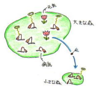大きな森は面積が広いので,多くの数の生物がすむことができます.小さな森には少ししかすめませんから,近親交配が重なって,病気等に弱くなることがあります.そのような場合,小さな森ではあっという間に病気が広がって,その種類の生物が絶滅してしまっても,大きな森だと,同じ種類でもたくさんすんでいますから,中には,その病気に強い系統もいて,その種が生き残ることが多いのです.