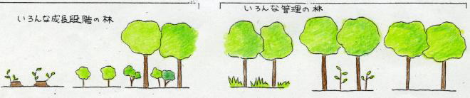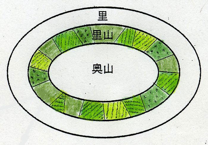 昔の林は、里−里山−奥山とつながっていて、里山には、里の生物や奥山の生き物もやってきて、にぎやかでした。(「やってくる」「行き来する」というのは、タネや花粉が飛んで行き来することも含めます。)里山も連続していました。当時、里山の林は、10〜20年くらいの間隔で木を切っていましたので、いろんな成長段階の林がありました。また、家ごとの管理のクセもあって、花の咲く木を残している林、あまり手入れしないで藪のある林、今年は手入れしない林など、様々な林がありました。