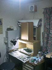 次に塗装で舞い上がる塗料やシンナーを効率よく換気扇に導く方法を研究します。実はわたしの模型の机のすぐ後ろがパソコンの背面がありまして、塗装すると結構ヤバイ配置となっております。(まずその配置を変えろという噂もありますが...)まあ、これについてはちょうど使っていなかった2mほどのロールカーテンがありましたので、これを天井に取りつけ、塗装の時に下ろし、部屋を分割することで対応します。さらに、塗装ブースを作り、ここから換気扇に舞い上がる塗料やシンナーを持っていくことができれば、部屋の空気はクリーンなままに保つことができるでしょう。そこで実験と言うことで、段ボール箱を利用して塗装ブースの試作品を作ってみました。(非常に粗末なもので恥ずかしいのですが右の写真です)工場の煙突をイメージして作ってみたのですが、換気扇と煙突が離れているため、当然効果はありませんでした。そこで煙突と換気扇を筒でつなげてみると、良く吸い込みました。つまり、換気扇に直につなげる事がポイントとなります。あと、問題なのは塗装スペースは正面以外を覆ってしまったので、照明があたらないのと、大きな物がブースに入らない事です。塗料をまき散らさないためには有効なのですが、次回はこの辺も考慮に入れて研究していきたいと思います。